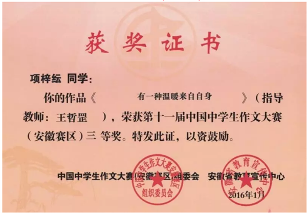 项梓纭高考外语考了140分!不仅如此,他的文采也很好,好到什么程度呢?获得过全国类作文竞赛奖——第十一届中国中学生作文大赛(安徽赛区)三等奖!